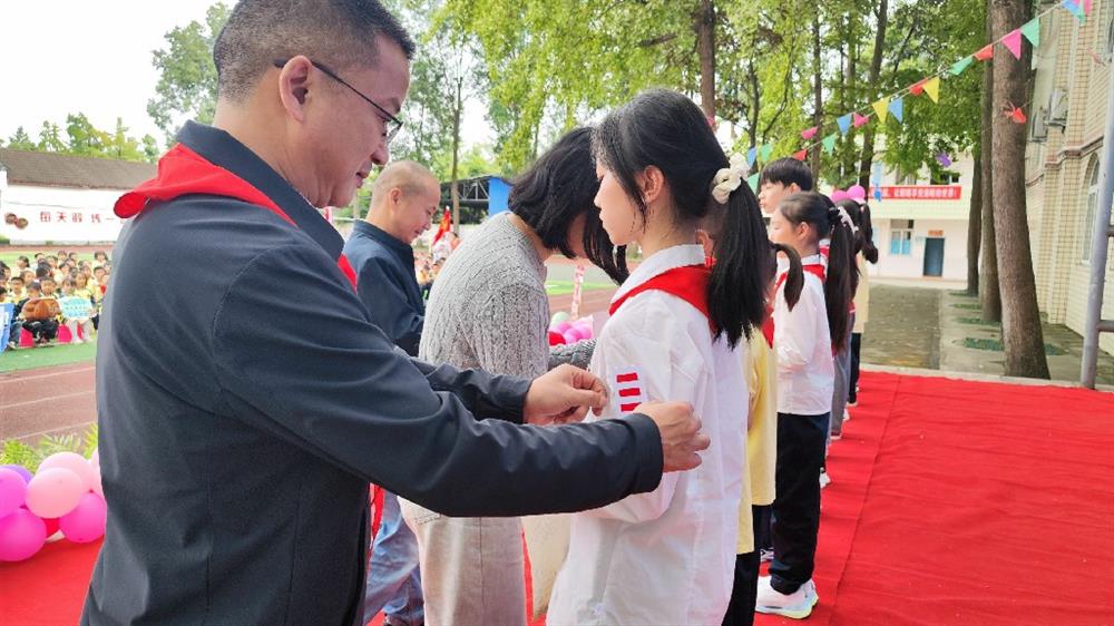 二年级25名新队员入队仪式是本次活动的核心环节之一。在大队辅导员宣读新队员名单后,五至六年级的哥哥姐姐为新队员佩戴红领巾。在大队长的带领下,新老队员举起右拳庄严宣誓,稚嫩的声音满含坚定。东一集团总校长鄢光文和北校区执行校长聂品为新任中队辅导员授予中队旗,新少先队员代表代皓宇发言,表达了成为少先队员的自豪与奋进决心。