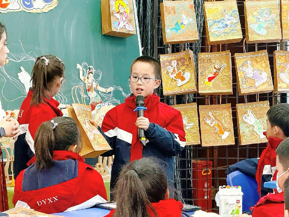 美术汪俞吉老师执教“妙想逐飞天”一课,巧妙衔接了艺术赏析与创意实践。汪老师借助丰富的视觉材料,引导学生梳理飞天形象的演变,解析其造型韵律与色彩美学。学生在观摩与模仿中感受传统笔法的精髓后,进入自主创作阶段:他们将飞天元素进行个性化演绎,绘制于手提袋、团扇等日常载体上。这些作品不再是单纯的临摹,而是融合了童真创意与文化理解的创意表达。随后,这些学生亲手制作的文创作品,成为国际交流中传递友谊的文化名片,让中外伙伴在互赠礼物间,直观感受到文化交融的亲和力与创造力,在实践中体悟传统文化的当代生命力。