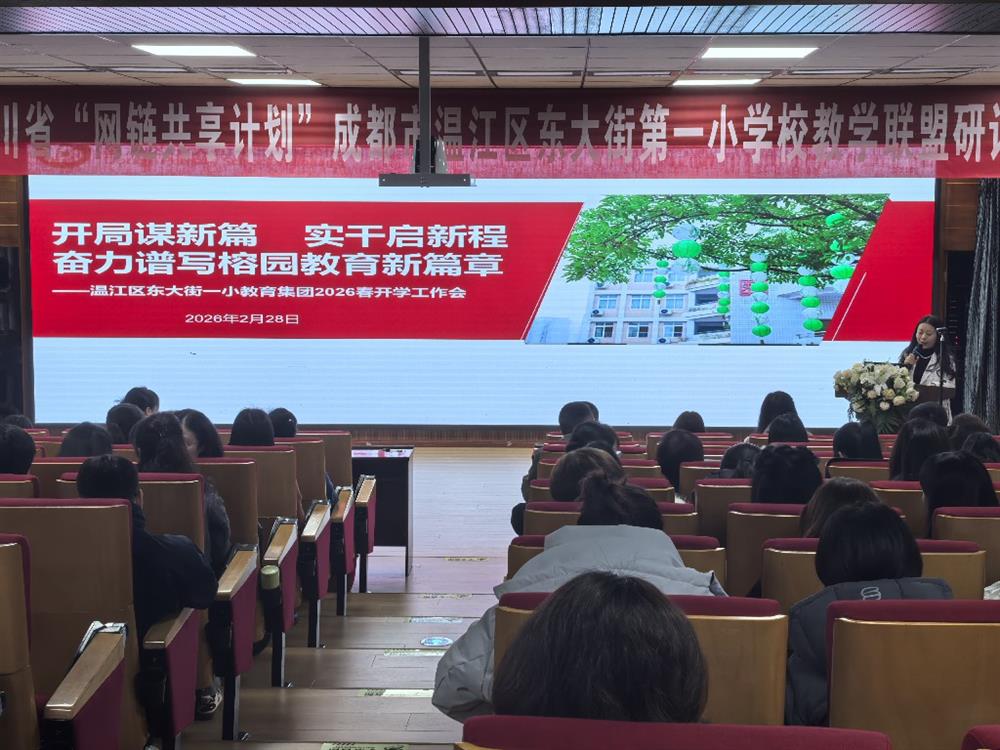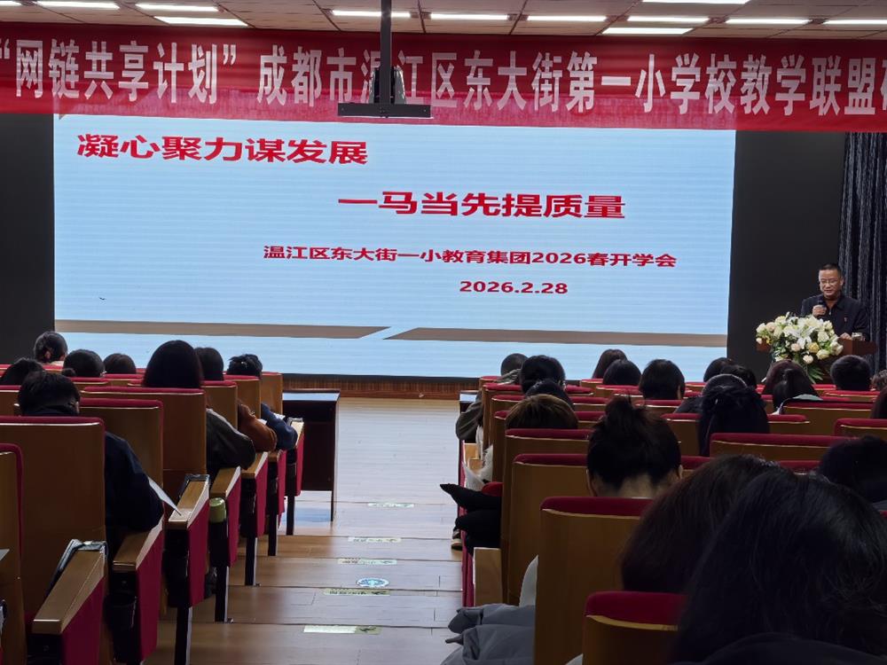 草木萌发,春山可望。2026年2月28日上午,成都市温江区东一教育集团以“线上+线下”融合形式召开春季开学工作会,通过高清视频会议系统实现“零距离”互动。集团总校三个校区(东大街一小、北校区、杨柳河分校)全体教职工同步参会,线上线下同频共振,?共谋新学期发展大计,为集团高质量发展注入新动能。