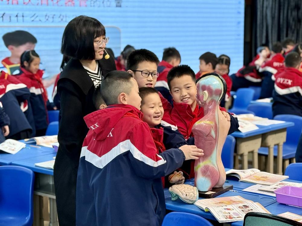 主播教师袁瑞璟执教《人的消化器官》。课堂以“饼干导游”的情境导入,学生在吃饼干、摸脖颈的具身体验中开启探究之旅。面对“食物进入人体后去了哪里”这一科学问题,学生经历“猜测—冲突—探究—修正”的完整思维历程:从绘制旅行图暴露前概念,到观察模型、阅读日记获取证据,再到修正认知、建构科学的消化系统模型。课堂上,学生的思维轨迹在绘图、拼贴、讨论中清晰可见,模型思维、实证思维、系统思维在探究中自然生长。