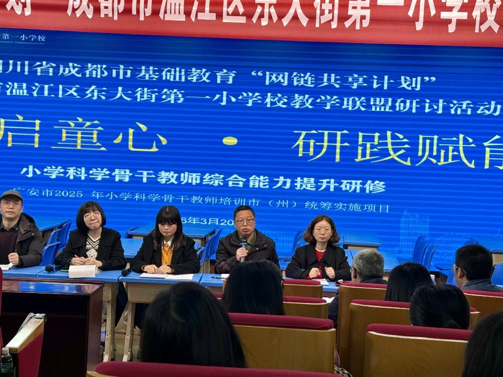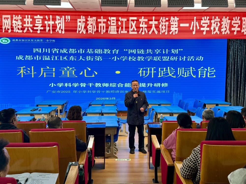 2026320日,春意渐浓,成都市温江区东大街第一小学校迎来广安市小学科学骨干教师培训班的53教师。本次研修以“科启童心·研践赋能”为主题,聚焦科学思维培养与教研共生实践,通过校园参观、课例展示、互动研讨、校史馆探访等环节,全面呈现学校在“网链共享计划”引领下的科学教育探索与区域协同成果。