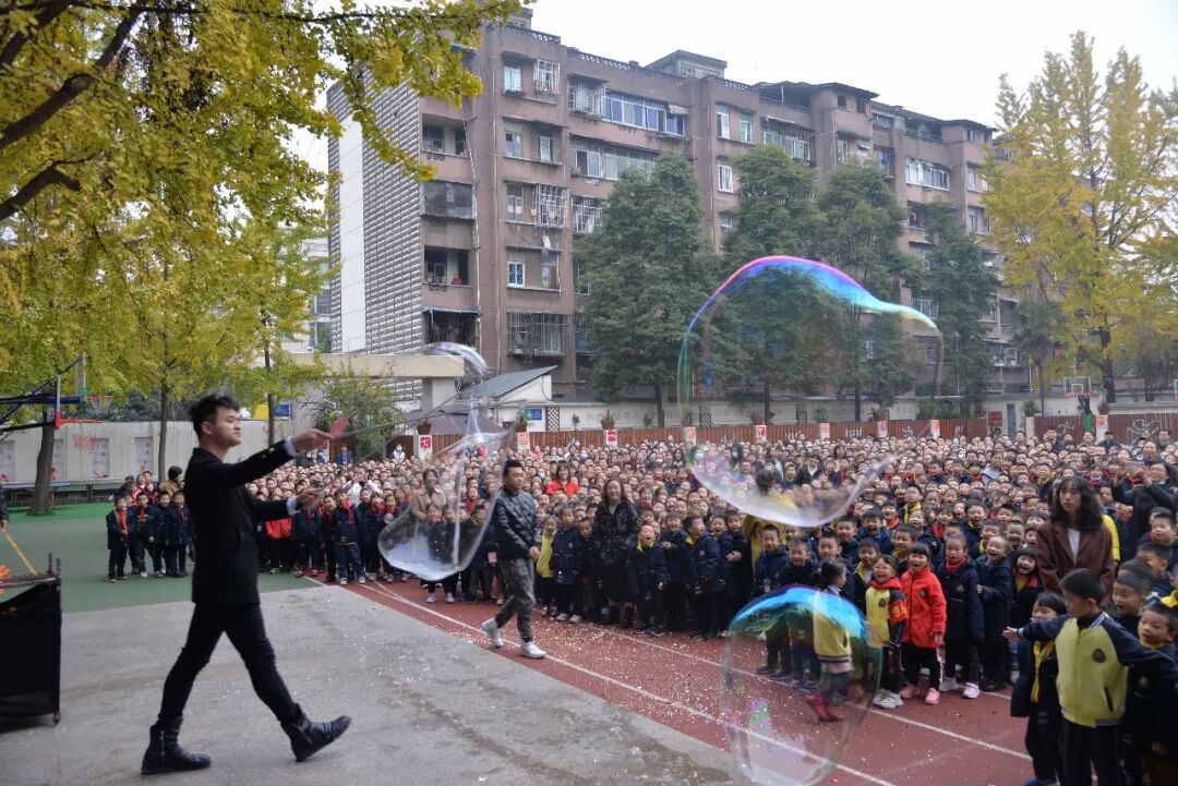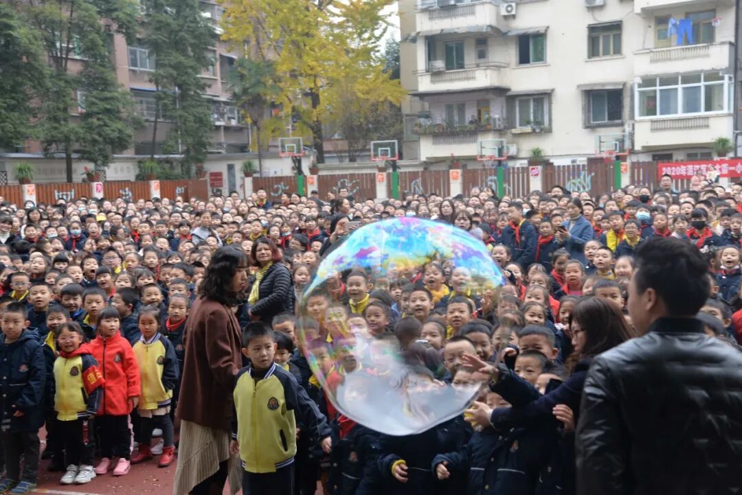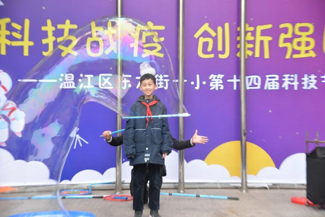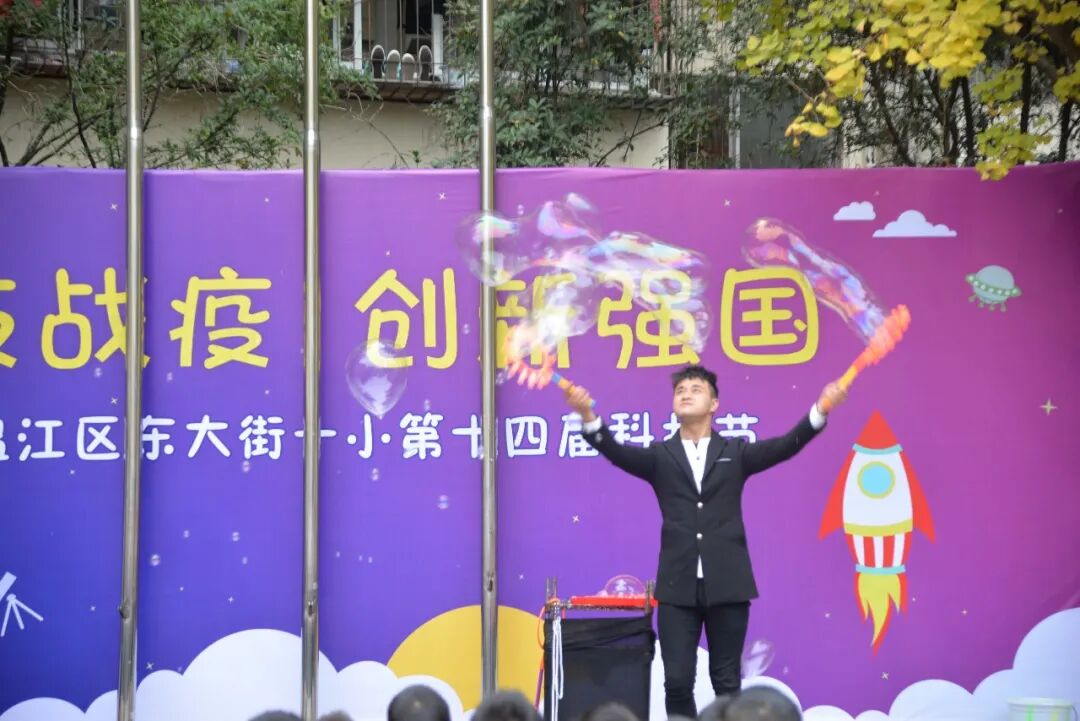 全校师生还沉醉在科学魔术的神奇中,台上突然冒出了欢乐的泡泡,大大小小、五颜六色的科技小泡,随着欢快的音乐,飘落到每个同学的身边,把科技的种子、种在每一个东一学生的心中。