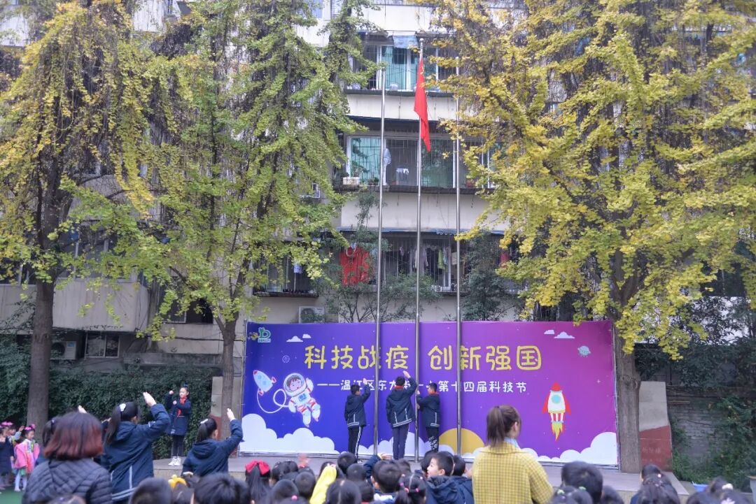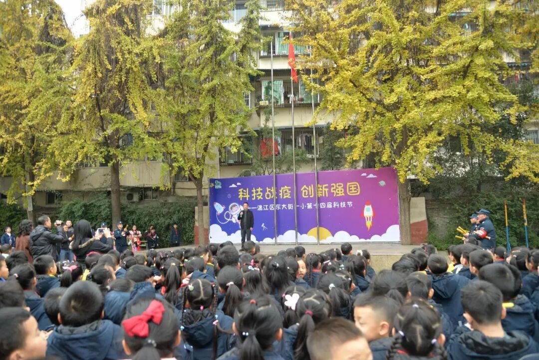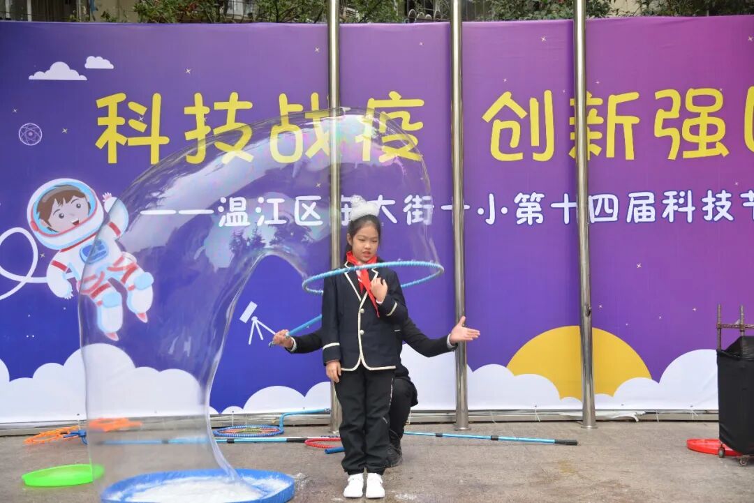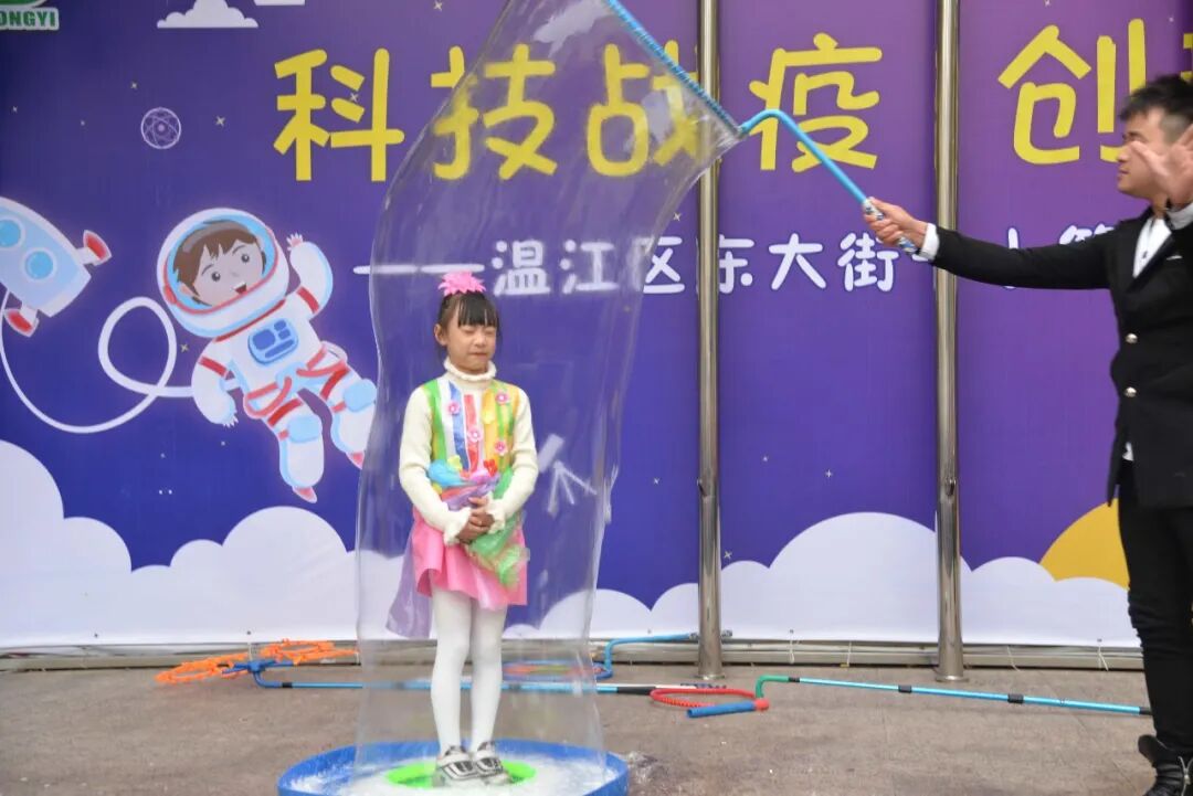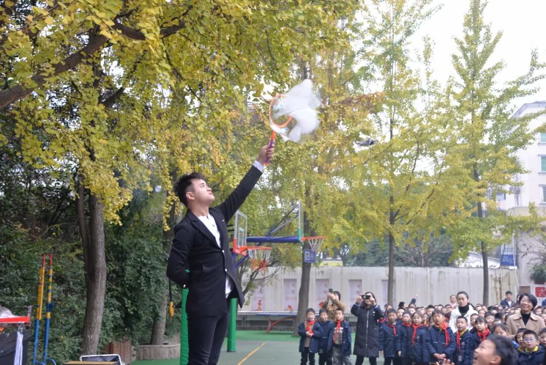 全校师生还沉醉在科学魔术的神奇中,台上突然冒出了欢乐的泡泡,大大小小、五颜六色的科技小泡,随着欢快的音乐,飘落到每个同学的身边,把科技的种子、种在每一个东一学生的心中。